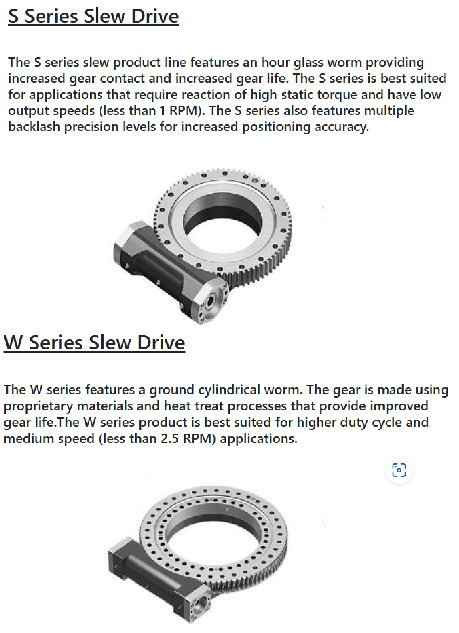 The S series slew product line features an hour glass worm providing increased gear contact and increased gear life. The S series is best suited for applications that require reaction of high static torque and have low output speeds (less than 1 RPM). The S series also features multiple backlash precision levels for increased positioning accuracy.